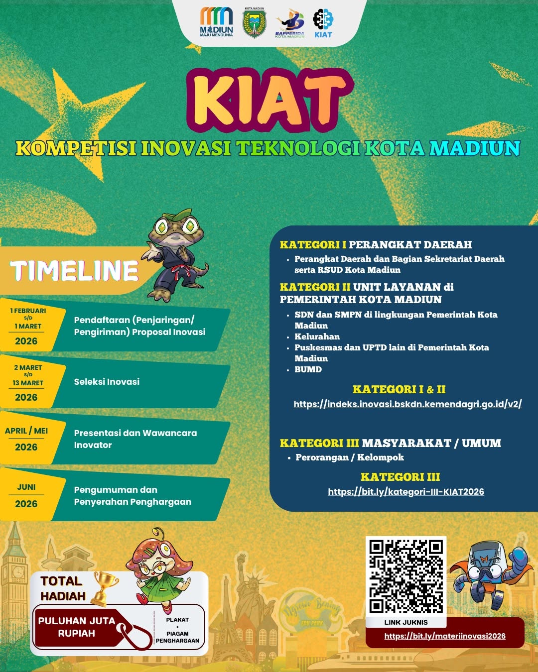 ✨Proudly Present✨ Kompetisi Inovasi Kota (KIAT) Madiun Tahun 2026 BAPPEDA mempersembahkan Kompetisi untuk segenap masyarakat Kota madiun (Perangkat Daerah, Unit Layanan Pemerintah, Masyarakat Umum). Kategori: - K-I : Perangkat Daerah - K-II : Unit Layanan di Pemerintah Kota Madiun - K-III : Masyarakat / Umum (Perorangan / Kelompok) Hadiah : Piagam + Plakat + Total Uang Pembinaan Puluhan Juta Rupiah 📆 Batas Pengiriman Proposal : 1 Mare.....